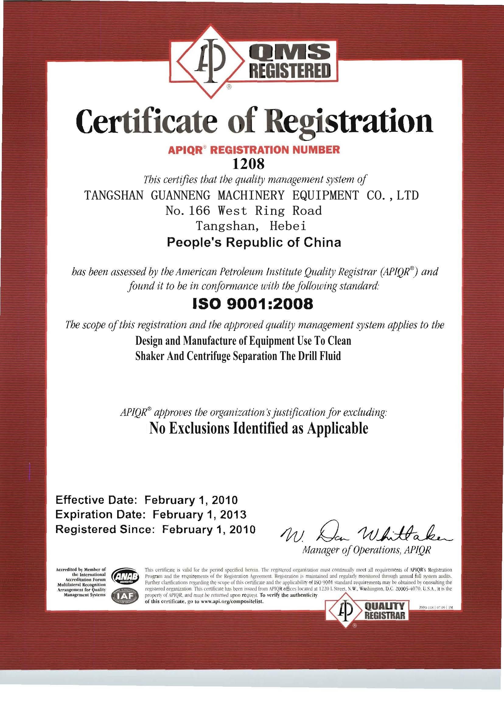 ????????????????????? ??????? 經過半年的努力,我公司的API(API:American Petrolenm Institute)認證在美國正式審核通過,并發給證書。 ???????從今年3月份起,根據國內外客戶的需求和我公司的發展,在API老師的培訓、指導下,我公司從生產、管理、采購、質量 等方面進行不斷的整改和提高,準備了詳細的資料,順利通過美國石油協會標準的審核。 ?????????API認證的通過,大大地滿足了國內外客戶的需求,從而為我公司設備、系統跨入世界石油行業打下了堅實的基礎。